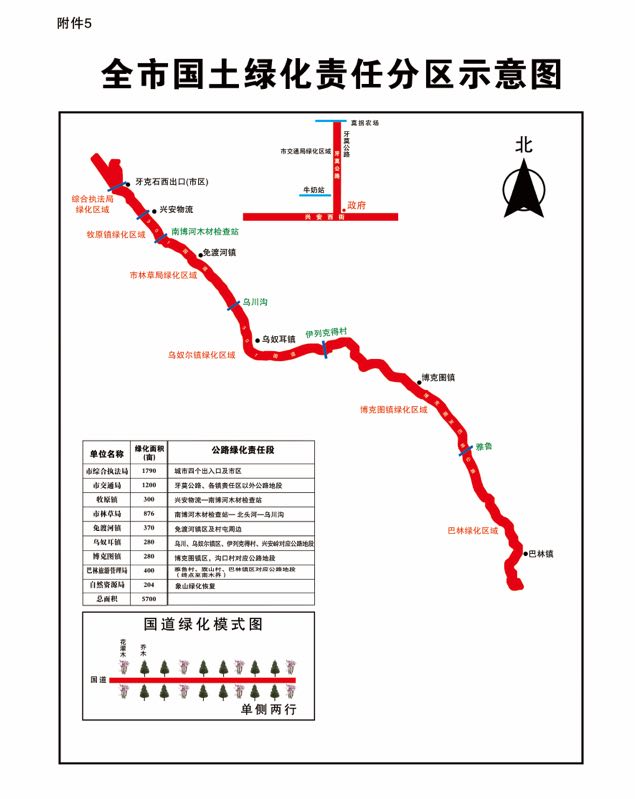2020年全市共落实重点区域绿化任务5700亩,补助标准为1500元/亩,项目总投资855万元。其中:交通局负责落实绿化面积1200亩,城管执法局负责落实绿化面积1790亩,林业和草原局负责落实绿化积876亩,自然资源局负责落实绿化积204亩,牧原镇负责落实绿化面积300亩,免渡河镇负责落实绿化面积370亩,乌奴耳镇负责落实绿化面积280亩,博克图镇负责落实绿化面积280亩,巴林旅游区管理局负责落实绿化面积400亩。具体绿化地块及标准按照上级批复的国土绿化造林作业设计、《造林技术规程》〈GB/T15776—2016〉《2019—2020年全市重点区域绿化任务分配表》《2020年国土绿化工作须知》为准。